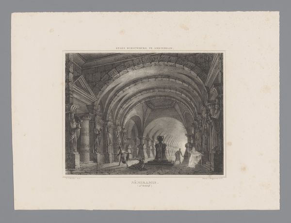 Albertus Verhoesen created this print of the underground vault of Vredenburg Castle in Utrecht, capturing a moment in the castle's ruinous state. Verhoesen made this image during a period of significant national self-reflection in the Netherlands, with a growing interest in preserving historical sites. The print shows the stark contrast between the dilapidated castle and the well-dressed visitors. This juxtaposition invites us to consider the politics of memory and the ways in which the past is consumed by different social classes. Light streams into the vault, illuminating the decay, but also casting a dramatic glow on the figures who seem to be observing a relic. The image evokes questions about power, history, and the gaze. This subterranean space once held strategic importance, and here it crumbles, inviting both curiosity and perhaps, discomfort. The artist encourages us to reflect on the relationship between those who remember and those whose histories are embedded in the stones themselves.