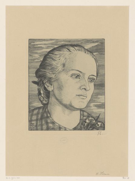 Curator: This drawing, "Portret van een onbekende vrouw" or "Portrait of an Unknown Woman," was rendered in 1912 by Richard Nicolaüs Roland Holst. It’s a pencil drawing currently held here at the Rijksmuseum. Editor: She looks introspective, even troubled. The monochrome and soft lines give the portrait a hazy, dreamlike quality. The pose, with her finger to her lip, seems so staged. Curator: Yes, note the delicate hatching and stippling. Holst meticulously built up tone and volume with pencil, creating a rich textural surface despite the limited value range. This isn't mere naturalism, it speaks more broadly to Symbolism's aesthetic. Editor: I find it poignant that it is a portrait of an unknown woman. It makes you wonder about representation and how some figures fade from the historical record, whilst others are pushed to the forefront through things such as artwork. Curator: Absolutely, although we don't know the sitter's identity, it speaks to broader societal trends in early 20th-century portraiture. Editor: Given Holst's socialist beliefs, one could almost argue it democratizes the genre. An every-woman made worthy of study through the lens of high art. Do you believe it’s a commission or perhaps just one of Holst's artistic studies? Curator: Knowing Holst’s typical output of posters, stained glass, bookbindings and textile design it could well be the later. A symbolic sketch to better develop more grandiose endeavors. Although undated, the inscription "Dedié à R.R." suggests that it may be a personal tribute or gift from Holst to someone close to him. Editor: Regardless of her place within society at the time, her expression really brings a sense of enduring contemplation. Curator: Indeed, Holst's command of line and form elevates it beyond simple representation. Editor: Ultimately the work forces one to consider, not only who is represented in art, but why. Curator: Exactly, and from a Formalist point of view, it masterfully employs tonal nuances and texture to create mood.