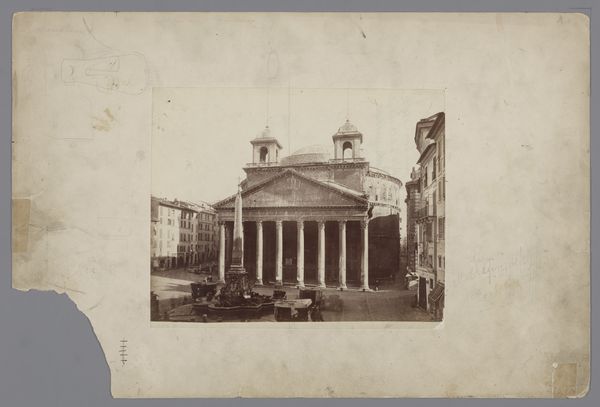 Editor: We are looking at "Gezicht op het Pantheon en de Macuteo obelisk te Rome, Italië", a gelatin silver print from between 1852 and 1900, attributed to Fratelli Alinari. The classical architecture and muted tones give it a rather timeless feel, almost like looking at a carefully constructed stage set. What elements of the composition stand out to you? Curator: The geometric precision. Note how the strong verticals of the columns contrast against the dome. Alinari plays with shapes to evoke an impression. Observe how the texture is evenly distributed with soft greys and mid-tones, creating tonal unity throughout. Editor: The symmetry is also quite striking. Does this deliberate composition point to anything specific? Curator: Undoubtedly. The carefully balanced forms speak to a desire for order and rationality, reflecting the Neoclassical aesthetic ideals prevalent at the time. It adheres to principles derived from ancient Greek and Roman art, with a strong emphasis on clarity, balance, and formal structure. Consider also the semiotic relationship between form and content. Editor: Could you expand on the connection of the forms? Curator: Certainly, the photograph translates spatial reality into a two-dimensional plane while simultaneously communicating its symbolic importance through rigorous arrangements. This is achieved using elements intrinsic to photography, such as focus, balance, texture, and especially how geometric relationships interact, signifying that rationality could manifest within a modern medium like the gelatin silver print. Editor: This deep dive into the geometry really changes how I view the piece. Curator: Indeed. Through formal analysis, the work's intricate construction reveals the intersection of form and idea. The power of rational forms lies at the heart of this print.
