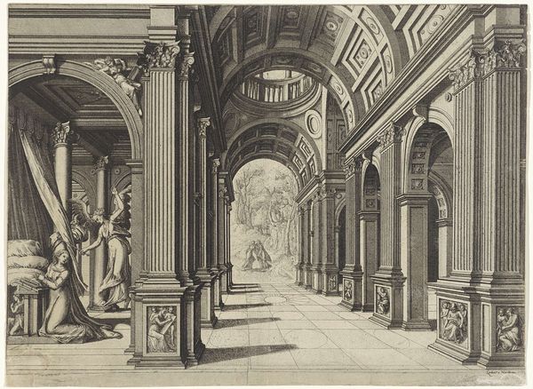 Curator: Ah, yes, this print—an engraving by Pierre Varin, titled "Interior of a Temple," dating from around 1750. Editor: Whoa, perspective city! It's almost dizzying. Makes me feel tiny, like an ant lost in a cathedral made of pencil lines. It's so rigid, and then this light just blasts through the top—giving it this divine spotlight effect. Curator: Indeed. Varin, working in the mid-18th century, would have been deeply immersed in Baroque aesthetics. Think of the elaborate theatricality and grandeur favoured by both the Church and State during that era. This isn't just a pretty picture. Editor: A propaganda piece then? I mean, look at the size of it. Imagine standing in a real space like this. The powerful just *love* reminding you who's in charge. Curator: To put it simply, in this print, it seems Varin really puts geometry to work. Every line serves to draw your eyes deeper into the architectural illusion. Editor: Absolutely. And it makes me question if such idealized spaces truly existed? Is he depicting reality or aspiration here? The people aren't the point—they're basically footnotes to the architecture itself! Curator: Varin's temple serves as a testament to power, achieved through design and perspective. The statue in the center is intentionally diminutive and the play of light reinforces its drama. The purpose, I'd suggest, extends beyond mere visual appeal. Editor: Fair point. Looking at it, I start imagining secret societies plotting in the shadows, you know? Underneath all that surface grandeur, a secret and a game! Curator: Yes. The engraving embodies how structures influence our perceptions and even shape our worldviews. A temple of that scale and stature isn't neutral, it actively communicates dominance. Editor: Right. So beyond the impressive technique is the undeniable power it radiates, making me wonder, whose truth, and whose ideal is depicted within its walls? Curator: Well said! Pierre Varin challenges viewers even centuries later.