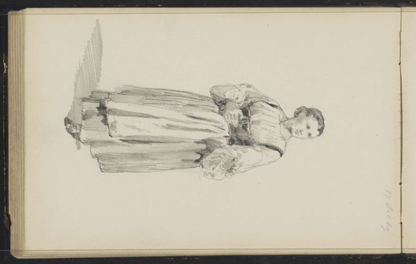 Curator: Let’s take a look at Cornelis Springer’s, "Vrouw met een mand op het hoofd," likely created between 1871 and 1872. It's currently housed here at the Rijksmuseum. Editor: Wow, there’s something so fragile about it, isn't there? It feels almost like a fleeting memory, just captured in wisps of pencil. Curator: Precisely! The delicate medium of pencil on paper, which emphasizes that initial response. When considering sketches from this time period, we should always consider what was left out, the stories never told or captured, if you will, and the economic constraints this likely created for the working class model depicted in this drawing. Editor: Absolutely. I can feel the weight of the basket even though it’s just lines on paper, a feeling not often conveyed so immediately in drawings of this nature. Do you think the fact that she is carrying that weight has significance here? Curator: Indubitably. Placing this sketch within its historical framework reveals several relevant considerations. Women were tasked daily with the duty of manual labor. Depicting her carrying this load not only alludes to that reality but also asks us to consider the socio-economic burdens she would have endured as a member of the working class in that era. Editor: It’s quite interesting, what feels spontaneous has so many other hidden meanings, doesn't it? Almost like a secret language being spoken. You look at the object as itself but its meanings quickly unravel something totally different... I can only imagine how many trips that woman made while bearing similar burdens on her head. It really is food for thought! Curator: And, in essence, art is supposed to make us consider precisely that. It encourages us to look beyond immediate aesthetic values into a deeper understanding of social relations. Editor: This really does exemplify just that, from the artist’s process to the realities faced by the model it depicts. There’s something deeply moving and profoundly human here, and in its gentle pencil lines and shaded forms, we are all capable of sensing and understanding the world differently.
