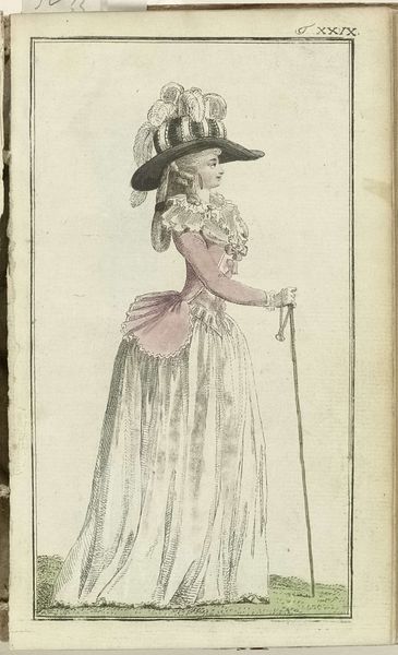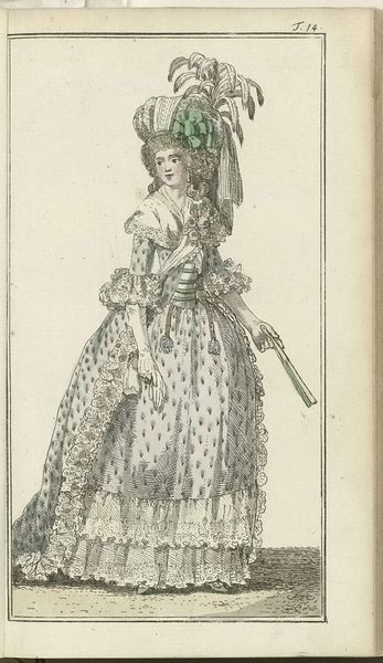 This is an illustration from Friedrich Justin Bertuch's "Journal des Luxus und der Moden" dating back to 1788, showcasing the heights of late 18th-century fashion. The print presents a figure adorned in elaborate attire, evoking a sense of aristocratic elegance. The composition is dominated by the verticality of the woman’s form, accentuated by the towering hat. Observe the complex interplay of textures and patterns: the ruffles around the neckline and sleeves contrast with the smooth expanse of the skirt, while the polka dots introduce a playful rhythm. These elements work together to destabilize any singular interpretation of the image, creating a dynamic visual experience. Consider how the artist uses line and form to not just depict clothing, but to communicate ideas about status and identity. The journal was at the forefront of disseminating fashion trends but also reflected and shaped the cultural values of the time. The elaborate style challenges fixed meanings, inviting us to question the relationship between fashion, representation, and social power.