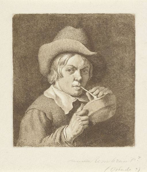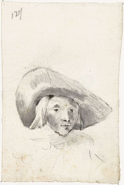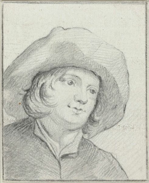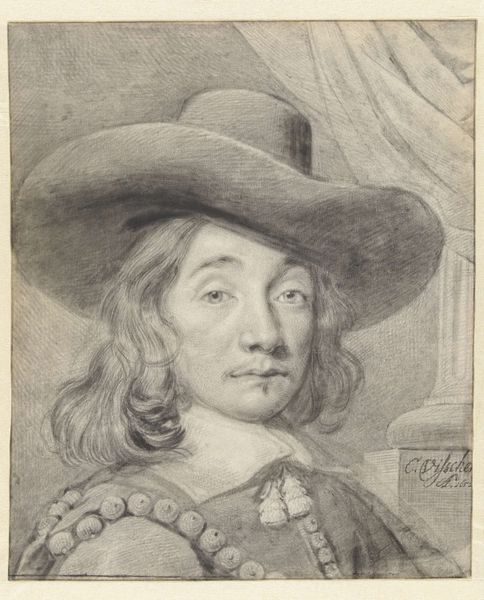Editor: This is "Studie van een man," or "Study of a Man," a pencil drawing by Jan de Bray, dating back to sometime between 1637 and 1697. The way the artist captured the light feels quite striking; it gives the figure a subtle, yet powerful presence. What stands out to you in this piece? Curator: I’m drawn to the subject's posture. Arms crossed, he confronts us with an almost defiant gaze, wouldn’t you agree? De Bray, working within the Dutch Golden Age, gives us more than just a portrait. It invites questions about social standing and individual identity. What do you make of the seemingly casual style juxtaposed with the formality of portraiture? Editor: I see what you mean. It’s not the typical grand, opulent portrait you often associate with the Baroque. There's a certain vulnerability that contrasts the Baroque grandeur. Curator: Exactly! It reflects the changing dynamics of the era. Consider the rise of the merchant class in Dutch society. Artists were now commissioned to portray a wider segment of society. The figure’s gaze and body language might be subtly challenging existing social hierarchies. Could the "caricature" tag hint at a subversion of those ideals? Editor: That's fascinating. It paints a whole new narrative! I was initially focused on the aesthetic aspect but considering the social and historical context adds a critical layer of depth. Curator: Indeed. It urges us to move beyond the surface and investigate the intersections of identity, class, and representation embedded within art. By examining the power dynamics, the artist isn't simply creating an image, they are engaging in a complex socio-political dialogue through their art. Editor: I see how looking at the art as a product of its time, and even a response to it, can completely reshape your understanding. It makes art history much more engaging than just memorizing dates and names.