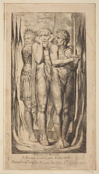 Editor: So, this is Charles Rambert’s "Plate Seven from Misery," a lithograph from 1851. The overall feeling is very…heavy. There’s an angel figure cradling someone, while another person looks on with this intense despair. What do you see in this piece, especially looking at its time? Curator: I see layers of cultural anxiety and hope, powerfully expressed through enduring symbols. Consider the angel, a figure deeply rooted in Western religious tradition. She's not just a benevolent being; she’s a visual embodiment of faith, actively intervening to prevent self-destruction. Notice her tender yet firm grasp, juxtaposed with the sharp tools beside the figure on the right. These are potent symbols! Editor: The figure on the right looks like a physical manifestation of misery. Curator: Exactly. Look at the visual language of Romanticism - a dramatic narrative meant to elicit an emotional response, but here Rambert is dealing with very modern themes of urban poverty and despair. The work prompts reflection on the choices individuals make when overwhelmed by suffering, doesn't it? Do you see the subtle cross at the top center, juxtaposed with that desolate scene below? Editor: I do. It is subtle. So the lithograph uses religious imagery, the angel, and the cross as symbols of hope against this grim reality? Curator: Precisely. It's an appeal to enduring values, a suggestion that even in the darkest times, faith and compassion offer a path away from ultimate despair. The work functions almost as a cultural mirror, reflecting anxieties about morality, faith, and the human condition. Editor: That’s fascinating, I see how these visual symbols contribute to the overall cultural narrative about poverty and suicide in that time period. Thanks for illuminating that. Curator: My pleasure. It is important to examine images not only for what they are but what messages they carry, and for how long.