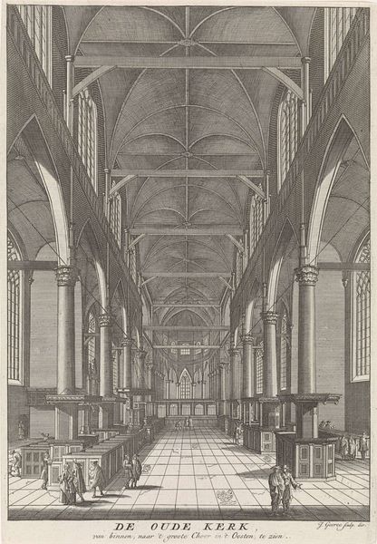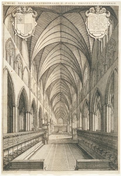 Curator: Here we have Jan van Troyen's "Lijkdienst voor Filips IV te Brussel, 1665," created as an engraving around 1666. It depicts the funeral service for Philip IV held in Brussels. Editor: Whoa, what an elaborate stage. I’m instantly struck by this sense of somber grandeur. It's meticulously detailed, yet the whole scene feels slightly oppressive, don’t you think? It’s that sky-high catafalque, I think. Curator: The scale and detail are remarkable for an engraving, aren't they? What van Troyen has captured here is not just a religious ceremony, but a carefully constructed piece of political theater. Funerals, especially royal ones, were incredibly important public events. Editor: A performance! It feels so formal, rigid even. Look at those rows and rows of mourners, all in their matching dark clothes. Almost feels like a theatrical set with the participants as players, puppets really. It brings to mind how much grief itself is often performative. Curator: Absolutely, and in the 17th century this was especially true. Think about the location. A cathedral provides an awe-inspiring, almost overwhelming backdrop for the service. The artist captures not only the architecture, but the power structure embedded in every pillar and arch. Editor: All those details are impressive. The lighting—or lack of it—adds to the heavy mood. You can almost hear the hushed whispers and the echoing organ. Makes me wonder about Philip IV himself, did anyone actually miss him? Was all this fuss genuine, or purely ceremonial? Curator: Good question. History shows that the visual display of power and the continuity of the monarchy often mattered more than the personal qualities of the deceased ruler. Prints like this one served a very specific purpose: to disseminate a certain image of authority. Editor: I suppose you are right. Knowing that perspective enriches my understanding and adds another, sad layer to my initial emotional response. What at first seemed like an alienating world of spectacle slowly begins to resonate, somehow... Curator: Indeed, this artwork serves as a valuable reminder that what we see is often shaped by those in power and can tell us so much more. Editor: Yeah, so the next time I attend a spectacle like this, I know to bring a skeptical yet thoughtful gaze, searching for what hides behind the elaborate design.