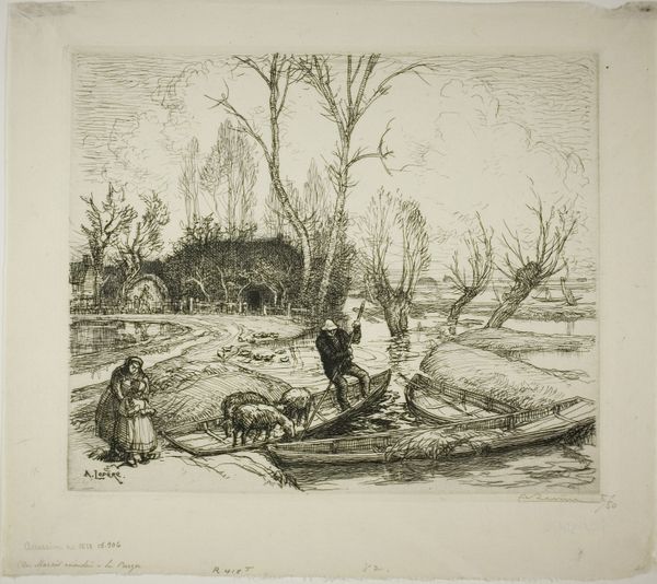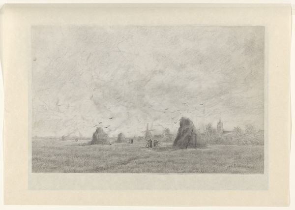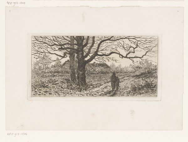 Editor: We're looking at Henri Rul's "Boer aan het werk in het veld," created sometime between 1872 and 1913. It's a print, an etching and engraving on paper. The overall mood is quite somber, emphasized by the stark, linear style. What do you see in this piece, Professor? Curator: Initially, my focus is drawn to the composition. Observe how the lines, etched with precision, create a textured surface, especially in the foreground. The artist's application of line directs the viewer's eye, establishing a spatial hierarchy that flattens somewhat into the background, doesn't it? What effect does that achieve for you? Editor: It almost feels like the figure is trapped or weighed down by the land itself, the detail kind of fades out into the background so it has this feeling of an almost surreal bleakness? Curator: Precisely. And consider the interplay between light and shadow. Rul doesn't use shading traditionally. Instead, he builds up the tone using cross-hatching and varying line weights. This evokes not only a sense of volume and depth, but also creates visual interest and surface tension across the picture plane. This use of line directs the gaze back to the field where the figure toils. Editor: So the success of the work isn't so much about accurately representing the figure, as a farmer, or the landscape as a setting? Curator: Exactly. The image transcends simple representation. It uses line, texture and contrast as symbolic language, asking us to think about what kind of landscape these formal qualities can reveal. It's a study in form. The arrangement and interaction of purely visual elements create meaning, not necessarily the subject matter itself. Editor: That makes me consider the work as a statement beyond just Realism, towards abstraction, about pure forms almost. Curator: A fascinating avenue for reflection indeed. By analyzing the formal elements, we begin to move beyond surface-level interpretation, towards an enriched and nuanced perspective on art's capacity for profound expression through visual structure.