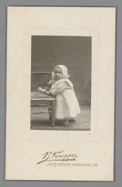 Editor: Here we have a photograph entitled "Portret van een meisje in witte jurk met strik in het haar," created by Emile Muns sometime between 1880 and 1920. The tones give it a really antique feel. I find myself immediately drawn to the girl's expression; there’s almost a stillness to it. How do you approach a piece like this formally? Curator: Initially, observe how the light plays across the subject. The illumination sculpts her figure, delineating the contours of her dress and face while softening the background elements. Note how the artist employs a limited tonal range, predominantly whites and greys, that create visual harmony. This controlled palette emphasizes form over color, inviting contemplation of the photograph’s composition and texture. Does the pose strike you as deliberately arranged? Editor: Yes, certainly. The girl's posture, the placement of the toys on the table, and even the chair—they all feel intentionally posed, not spontaneous. The frame within a frame also seems very purposeful. What do you make of those formal choices? Curator: Precisely. This staging encourages us to examine the constructed nature of the image. The balanced distribution of elements - the girl offset by the furniture - indicates the artist's careful manipulation of space. What significance might be read into the child's direct gaze? Editor: Perhaps the direct gaze is intended to connect with the viewer, demanding our attention and encouraging us to consider the girl's internal state? It is fascinating how the artist controlled all elements within the frame. Curator: Agreed, understanding the meticulous construction of this image allows us to see it not merely as a record but as a crafted narrative. This formal analysis helps to explore these images through the ages. Editor: Absolutely, shifting the focus from the subject to the structure has revealed the intention behind this compelling artwork. Thank you for shedding light on these subtleties!