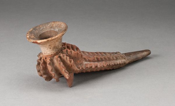 This is a small, unknown date, Inca animal form tube, possibly used for lime. It’s made with meticulous care, showing an abstract elongated animal, carved from a material of warm, earthy tones. The piece has an intriguing formal structure. The body of the animal transitions into a cylindrical form, creating a tension between organic representation and geometric abstraction. There is a play with the tubular shape which might have been influenced by the material constraints, while adding a symbolic dimension linking the animal form to ritualistic functions. Such a piece destabilizes the usual separation between art and utility. In structuralist terms, it operates within a cultural ‘grammar’, where the combination of animal form and functional design conveys symbolic meanings related to belief systems. Ultimately, the piece invites us to consider how its form and construction are not merely aesthetic choices but are deeply enmeshed with the cultural and functional imperatives of its time.