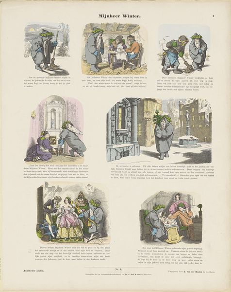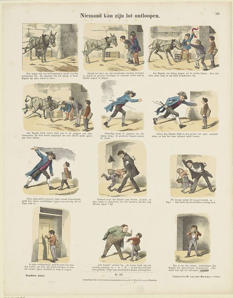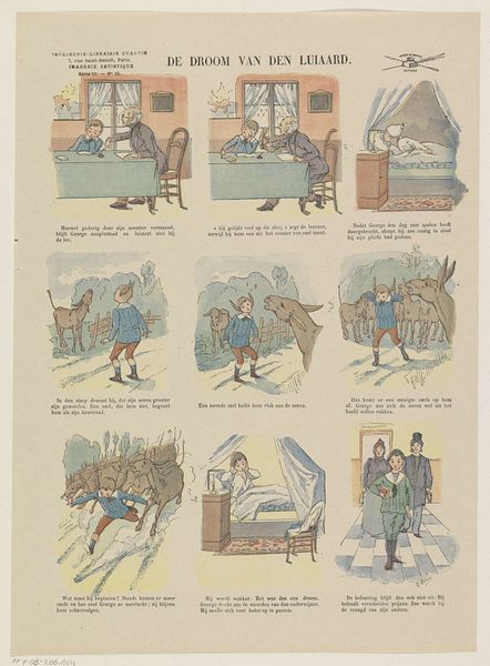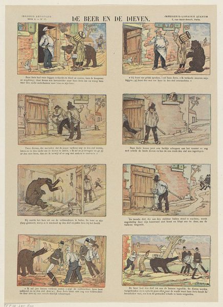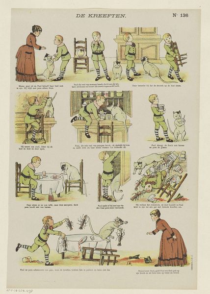 This lithograph by Albert Quantin, titled 'De snoepachtige Pieter,' presents a series of scenes depicting a boy's misadventures, each framed like a comic strip panel. The dominant symbol here is the falling figure, repeated throughout the narrative. We see the protagonist tumbling from chairs, ladders, and even into a washtub, each fall echoing the ancient motif of Icarus, plummeting from the sky. This motif, found in classical art, often symbolizes overreaching ambition and inevitable failure. Here, it takes on a more humorous tone, reflecting the boy’s mischievous attempts to steal sweets. But consider how this symbol resonates across time. From the tragic fall of Phaeton in Roman sculpture to the comedic tumbles in commedia dell'arte, the falling figure evokes a primal fear and a schadenfreude delight. The image touches on our collective memory, where the fear of failure is ever-present, softened by the humor of youthful folly. This image’s emotional power lies in its ability to evoke a deep, subconscious understanding of human frailty and ambition. The non-linear progression of this symbol, resurfacing in different contexts, highlights how certain archetypes persist, adapting to new cultural narratives.