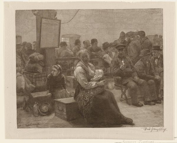 Hans Smidth created this undefined artwork titled "Et Markedstelt," or "A Market Tent," sometime during his career, using an unidentified medium to capture a bustling scene inside what appears to be a temporary tavern. The piece offers a glimpse into the social and cultural life of 19th-century Denmark. The setting suggests a vibrant market day, a crucial element of the social and economic structure of the time. The image uses visual codes such as dress and posture to subtly convey the social status and roles of the various figures depicted. Note the contrast between those who appear to be working-class and those with top hats, suggesting a more elevated social position. What might have drawn Smidth to represent this scene? Was he interested in the communal aspects of such gatherings, or perhaps in the social stratification they revealed? Understanding this work fully requires us to consider the socio-economic context of 19th-century Denmark, looking into archives and local historical records to unearth the significance of market days. The artwork's lasting value lies in its capacity to serve as a historical document, illuminating the intricate web of social interactions and hierarchies that were part of daily life.