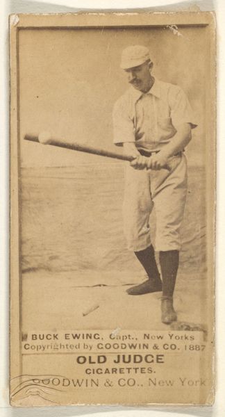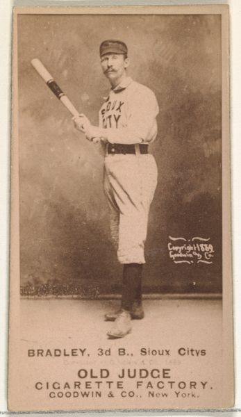 This is a baseball card from the Old Judge series, made by Goodwin & Company in 1888. It features Foutz, a pitcher for the Brooklyn Bridegrooms. These cards, distributed with Old Judge Cigarettes, capture a moment in the evolving cultural landscape of late 19th-century America. As baseball rose in popularity, these cards acted as a form of advertising, but also as a reflection of societal values and aspirations. The image of Foutz, posed and idealized, speaks to the era's construction of masculinity, athleticism, and the burgeoning celebrity culture. It's also important to remember that tobacco products like Old Judge Cigarettes were marketed widely, including to young people. It's an eerie reminder of how advertising once shaped social norms and identities. The image of Foutz, therefore, becomes intertwined with issues of commerce, health, and the construction of a national identity, where baseball heroes were, and still are, used to sell products.
