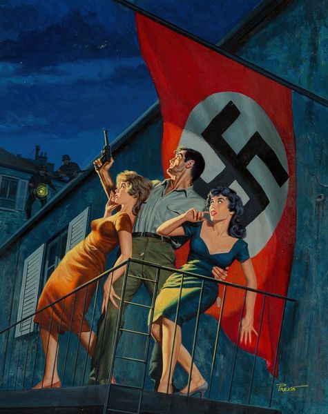 Curator: Before us is "I Am Sun Mu," an acrylic painting. The artist, who goes by the pseudonym Sun Mu, is a North Korean defector. Editor: It's immediately striking how the flatness of the background colors clashes with the attempt at realism in the figure. The figure seems to almost float in front of the backdrop of blue and red. Curator: The symbolism here is complex. We see what appears to be a portrait of Kim Jong-Il saluting against the North Korean flag, yet, remember, it is Sun Mu himself representing that figure. This could signify many things: internal conflict, defiance, identity play. Editor: The brushwork is loose but deliberate. See the vertical strokes in the blue section—they don't try to hide the process of painting. It's almost like a stage set. I feel like that directs the gaze not only at the composition, but at the work that had to go into its arrangement. Curator: It reminds us of propaganda portraiture. But that's just the surface, it references our collective, historical awareness of power structures. Propaganda art, often seen in communist states, is traditionally used to glorify leaders. And yet Sun Mu lived the real consequences of living in this regime. This raises several questions about freedom, personal trauma, and artistic expression. Editor: Notice the details, like the glint of the glasses and the precisely placed hand. There is the clear intent of naturalism in these parts. The contrast amplifies a tension that extends beyond political symbolism and into an internal, more individualized study of power and, really, performance. The formal structure serves that quite well. Curator: This act of impersonation through self-portraiture is also really fascinating and challenging. By inserting himself, Sun Mu reframes not just the image, but the very notion of North Korean leadership. In a way, Sun Mu seizes that authoritarian space for the creation of himself. Editor: Precisely, it takes familiar imagery and turns it inside out with the arrangement of just the right shapes, the tension of line, and juxtaposition of materials to achieve complex themes that may resonate deeply with different beholders. I will definitely be revisiting this canvas.