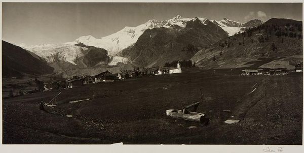Editor: This photograph, "The Eiger, Mönch, and Jungfrau from Wengernalp" by Adolphe Braun, captures the Swiss Alps in a serene, almost humbling way. The small buildings nestled at the base really emphasize the mountains' grandeur. What strikes you most about this image? Curator: The image is deeply rooted in a Romantic sensibility, yet its photographic medium lends it an aura of objective truth. These mountains are often imbued with symbolic weight—Jungfrau, the Virgin, Mönch, the Monk— suggesting a spiritual hierarchy. How might the cultural perception of mountains as sublime spaces influence our reading of the image? Editor: That's fascinating! The names themselves add another layer of meaning. So, it's more than just a landscape; it's about how we project ideas onto nature? Curator: Precisely. Braun is not merely recording, but curating a visual experience, one that echoes the cultural memory and ongoing fascination with the Alps as both sanctuary and formidable force. Editor: I hadn't considered that. Thanks, I'll never look at a mountain photograph the same way again!