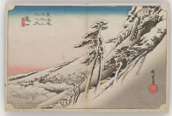 Curator: Katsushika Hokusai’s print, "Back View of Fuji from the Minobu River," created between 1830 and 1833, offers a serene vision in ink and color on paper, now residing here at the Minneapolis Institute of Art. Editor: It's interesting. The composition initially strikes me as slightly unsettling; there’s a certain awkwardness in how the large, dark forms intersect with the pastel washes and the peak of Fuji itself feels almost secondary. Curator: Perhaps, but I think Hokusai's formal genius lies in his dynamic balance of color fields and graphic lines. Notice how the flat planes of blue in the sky and stylized waves in the river contrast with the topographical density of the trees. The artist uses contrasting textures and color to flatten perspectival depth and construct a visual dialogue. Editor: But think of the materials. These are woodblocks. The labor involved is quite intensive to prepare, carve, and print with such precision, not to mention the pigments themselves derived from minerals, plants, and painstaking processing. The everyday person making these prints worked with such skill to feed a voracious popular demand. Curator: Indeed, the mode of production impacts the aesthetic quality. Look at the precise linear carving that defines forms. Consider how lines of color produce value rather than modeling. Woodblock printing lends itself to stylized simplicity, creating iconic shapes rather than illusions of nature. Editor: Precisely! And let’s not ignore the implied labor within the print itself—those tiny figures leading laden horses on that path up to the right— their efforts integral to sustaining the same systems of commerce that put this art into circulation. Curator: Agreed, by examining the interaction between representational space and decorative design, a formalist approach reveals how the artist plays with visual signifiers. How color and shape are employed, constructing meaning and challenging our perception. Editor: Ultimately, the enduring legacy stems from the integration of materials, process, and an artist’s acute observation of the toiling life. Considering this brings a renewed appreciation for both the craft and the context behind the captivating image of "Back View of Fuji."