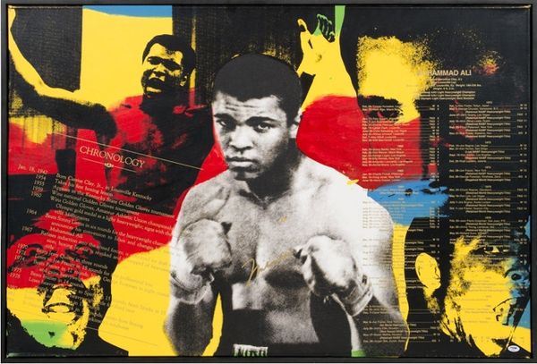 Curator: Immediately, what strikes me is the contemplative gaze—almost mournful, despite the formidable presence. Editor: I concur. The composition itself reinforces this sentiment. The monochromatic palette emphasizes the texture of his skin, while the added marks on the edges constrain and emphasize the main subject. Curator: Indeed, we see a photograph titled “Muhammad Ali.” Created in 1972, it offers more than just a celebrity portrait; it is also associated with the Black Arts Movement, indicating a potent symbolic dimension. Editor: Symbolism absolutely permeates this piece. Look at how the artist uses low key to convey a deep emotion or conflict within the man. I cannot but feel how these cross-like symbols evoke a deep burden within Ali, regardless of whether they represent crosses or some other type of marker. It makes it so we almost wonder what lies outside the image. Curator: Given its place within the Black Arts Movement, do you see the image carrying the weight of broader social concerns too, besides merely reflecting Ali’s psychological state? The visual texture really evokes this, somehow. Editor: Precisely. One may infer myriad messages given the cultural setting of its original context and even from today’s perspective. However, consider how the stark contrast directs our attention toward the planes of the face. It is also key to remember how portraits are made: someone has directed them, which imbues it with meanings too. Curator: Do you get a sense of resilience, even defiance, through that controlled intensity? Even with that constraint imposed by the edges? Editor: In a way, yes, paradoxically, thanks to how Ali’s expression pulls against those cross marks—almost wanting to get out of it. Those luminous eyes also suggest hope despite all the constraints of composition and cultural elements that weigh him down. Curator: To me, it resonates as a reminder of the burdens and contradictions faced by a figure elevated to the level of an icon. Editor: It’s an incredibly nuanced photograph and really gives an impactful account on someone with a monumental reputation. It provides complexity that helps us to truly understand his deep inner world and cultural legacy.