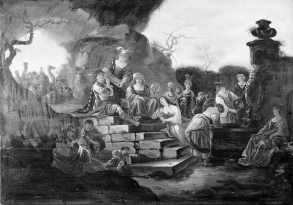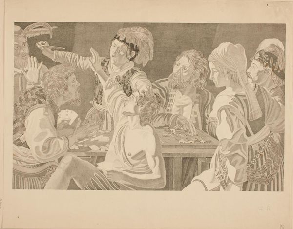 Curator: This is Fortuné Delarue's "La Loge," currently residing here at the Harvard Art Museums. It's a small piece, just a few inches in either direction. Editor: My immediate thought? Anticipation. A flurry of hats and eager faces peering out. What's about to unfold on that stage? Curator: The loge, the theater box, was a space of both visibility and observation. Delarue captures that tension beautifully, doesn't he? All those feathers... Editor: Feathers as symbols of flighty fancy, perhaps? The women, adorned and poised, become part of the spectacle themselves. Who's watching whom, really? It's all a bit circular, isn’t it? Curator: Absolutely. And notice the unfinished quality— the piece is more about gesture and impression than precise detail. Delarue gives us a glimpse, a suggestive sketch of a social ritual. Editor: It’s almost voyeuristic, like a charcoal-smudged secret whispered across time. I like that, the sense of something fleeting. Curator: Fleeting, indeed. A moment of poised expectation, distilled into ink and paper. It makes you wonder what they saw. Editor: Or what they hoped to see. Always a crucial distinction!