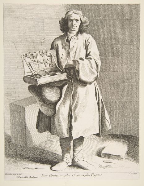 Curator: Today, we’re looking at "The Reading of Lottery Winners," an etching and print crafted around 1746 by Anne Claude Philippe, Comte de Caylus, currently held at the Metropolitan Museum of Art. What strikes you first? Editor: The man’s upward gaze. It lends a feeling of hopeful anticipation, like he's searching for something just beyond his reach. It is echoed and reinforced by the verticality of the print, creating a clear visual axis, don’t you think? Curator: Indeed. I’m particularly interested in Caylus’s choice of printmaking, an inherently reproducible medium. The lottery, as a form of early state-sponsored gambling, was expanding rapidly in 18th-century France, becoming accessible to different levels of society. Was the ability to disseminate this image widely part of Caylus's plan? Editor: Absolutely. The etcher captures the cultural zeitgeist of its time. See how the texture of the man’s coat plays against the slicker ground he treads. What is the intended feeling behind the contrast here, if not accessibility through the medium, of a game like the lottery? Curator: He clearly emphasizes the man's role as an intermediary— a lottery ticket dispenser, rather. Notice how the paper documents of the winning numbers become nearly as prominent in the composition as the man himself, almost wrapping his arm as though defining who he is. Editor: Semiotically potent. He quite literally embodies his role. But let’s not overlook the etching technique. Caylus varies line thickness and density to create depth and volume. Notice that, with subtle tonal gradations, he articulates not just form but also evokes atmosphere. The use of cross-hatching to define shadows, isn’t this simply gorgeous? Curator: The man’s dress points to a social role, but what did the lottery itself offer its players, from artisans to aristocracy? How might it have momentarily blurred those boundaries with the illusion of a shared chance at wealth? The lottery becomes, through the material process of this print, both a signifier of opportunity and a reinforcement of societal structure. Editor: Very compelling thoughts. The artwork’s delicate precision combined with its powerful evocation of light, tells its own layered tale. It is certainly worth reflecting on this portrayal of anticipation, luck, and the material conditions of its production. Curator: Agreed. It’s through analyzing all of these factors that a clearer vision for art can develop. Thank you for your insight on the subject today.