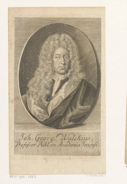 Curator: It's captivating how meticulously engraved lines can convey such personality. This piece, created by Johann Martin Bernigeroth in 1733, presents "Portret van Adam Friedrich Glafey," currently held in the Rijksmuseum collection. Editor: My first impression is the level of detail achieved with what appears to be just lines. There is almost a sense of movement and certainly considerable personality emanating from it. Curator: Bernigeroth clearly understood how to exploit the burin to its full potential. I wonder what significance Glafey's position as "Hoffrath und Archivarius" held in society and how his official duties influenced Bernigeroth's artistic decisions in terms of conveying authority and status? Editor: Exactly! Engravings like this were commodities, objects intended for widespread distribution to communicate very specific messages. Notice the heavy wig and official dress: these weren't just personal choices but signifiers meant to project an image, and the success of the piece resides in its role as a political tool as much as its artistic merit. Curator: The consistent weight of the line and precision used suggests a calculated approach geared toward efficient and effective reproduction. One imagines the intense labor that goes into producing multiple copies of the image. I mean, this portrait functioned as a reproducible form of currency, wasn't it? Editor: Yes, circulating his image among specific social circles would enhance his recognition and potentially his political and social influence. Bernigeroth’s print thus plays a pivotal role in shaping the perception of its subject and its widespread consumption reinforces ideas about hierarchy and the social position of influential officials in society. Curator: Analyzing the tools, labor, and reproduction helps to reveal the mechanics behind the promotion of powerful individuals through such printed portraits. The engraving highlights how social dynamics were actively manufactured and distributed through material goods such as prints. Editor: Indeed. Thinking about who would have commissioned and consumed it is equally important, highlighting how institutions and networks fostered particular political narratives through images, which helped people understand their role within complex societal hierarchies.