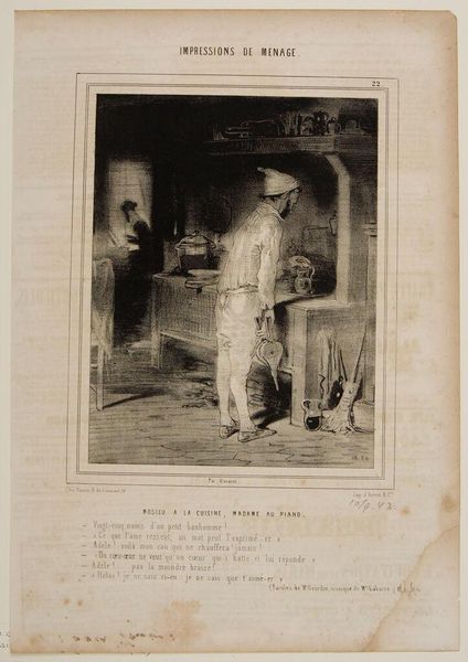 Editor: So, this lithograph by Paul Gavarni from 1843, "Man Going to Make Coffee While His Wife Plays Piano," gives us a little domestic scene. There's almost a melancholic mood, right? Like the guy's stuck doing chores while she enjoys her music. What jumps out at you? Curator: Ah, melancholic, yes! It’s like a shadow puppet play of domestic life, isn't it? Gavarni captures that unspoken tension, the quiet hum of resentment perhaps. The lighting almost seems to trap the man in the kitchen’s gloom. Have you noticed how he holds the bellows – an instrument, but one of servitude here? Editor: Exactly! It's not a trumpet of triumph. It’s a tool. The whole composition highlights that contrast – music versus the mundane. I am also struck by the Romantic aesthetic. Do you see anything from Romanticism present? Curator: Absolutely! Gavarni wasn’t just illustrating a genre scene; he was hinting at something deeper. That push-pull, the idealized woman versus the grounded man, is such a Romantic trope. The woman represents artistry and expression, whereas the man represents working-class oppression and lack of liberty to express himself and flourish. It whispers, doesn't it? Makes you wonder about their conversations after the music stops. Do you find that this image brings you to empathize with this character, in some way? Editor: Definitely. It is making me reconsider how Romanticism can permeate everyday life and art, and it seems not to always be about epic heroism, but even be about quiet desperation. Curator: Right! Romanticism isn’t always a tempestuous sea; sometimes, it’s the stagnant water in a forgotten coffee pot. Editor: True, seeing the mundane as emotionally charged as Gavarni did, reveals the richness in the smallest moments. Curator: Indeed, now every time I hear a piano, I will reflect on the untold kitchen sink dramas going on across the globe.