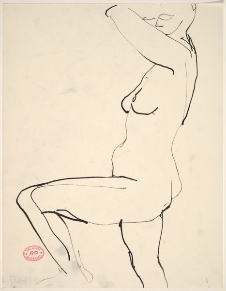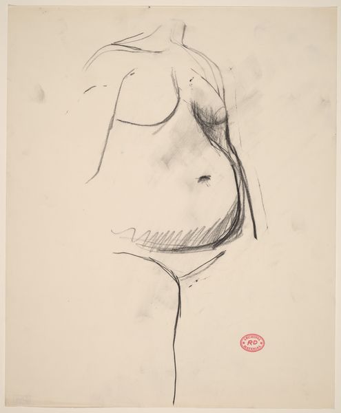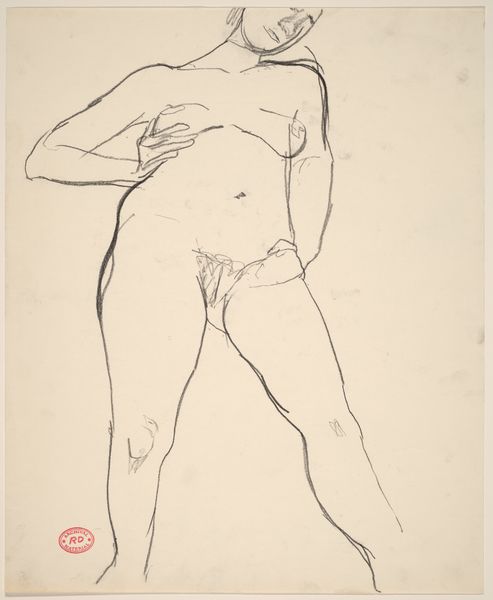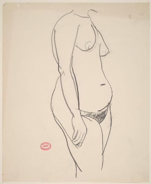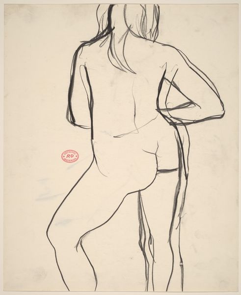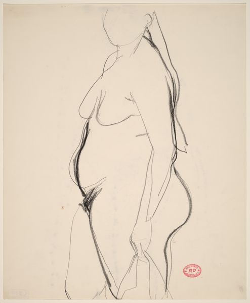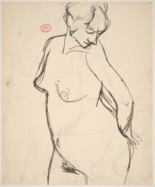 Curator: This is an untitled drawing by Richard Diebenkorn, created sometime between 1955 and 1967. It depicts a standing female nude rendered in pencil. Editor: There's an undeniable vulnerability in those tentative lines. The body feels…real, unidealized, caught in a moment of introspection. Curator: The simplicity of the medium belies the complexities of its creation, though. Diebenkorn was working in California during a time of immense cultural shifts. The emphasis on the body, even in its imperfect state, speaks to evolving attitudes toward representation and the female form within a rapidly changing society. It pushes against established conventions of classical nudes within art history. Editor: And think about the labor—the repeated gestures, the subtle pressure of pencil on paper. He's not just depicting flesh, he's revealing his own engagement with the subject through the materiality of the drawing. The act of drawing, the very physical process, leaves its own mark. This wasn't mass produced; it's a unique handmade object, evidence of labor. Curator: It’s a dance between abstraction and representation. Diebenkorn doesn't aim for hyperrealism; instead, he captures the essence of the figure, leaving room for interpretation. This opened up opportunities for female artists too who sought alternatives to male objectification of women within the fine arts. Editor: Exactly. The lines almost seem to question themselves. Look at how the shading is only implied; and notice the use of hatching—these areas carry such incredible intensity given how lightly drawn they are overall. This isn't about perfection. It is more about honest portrayal achieved with extremely basic materials. It becomes all about the surface quality itself achieved with just pencil strokes! Curator: It invites us to reconsider traditional notions of beauty, femininity, and even art itself. Editor: Definitely. This pencil sketch resonates because it exposes both the artist’s and the model's own lived experience. Curator: I am drawn in by how art reflects and challenges our culture, inviting important social conversations. Editor: Indeed, from the simple tools of drawing to the greater society's complicated relationship with the body, it's all interconnected!