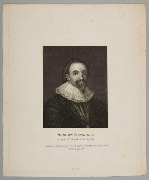 Curator: This is a portrait of Sebastiano Serlio by Jacopo Bernardi, who lived from 1808 to 1908. Editor: Immediately, I see the intense gaze fixed upon the book. It feels like a portal into the world of the Renaissance scholar. Curator: Serlio was a significant architect and theorist whose architectural treatises deeply impacted the Renaissance, and this image reflects a rise in the status of architects as intellectuals. Editor: The ruff collar almost imprisons him, yet it also signifies status, knowledge, and a connection to established visual tropes of intellectualism. Curator: Absolutely, his portrait fits into a broader cultural context where images of scholars were important affirmations of knowledge and authority, and this print makes that accessible to a wider audience. Editor: The book in his hands acts as a powerful symbol of wisdom. I am curious to know what wisdom it holds. Curator: Indeed, it provokes thought about the power of images to shape and transmit cultural values. Editor: An intriguing image that continues to prompt reflections on tradition and intellect.