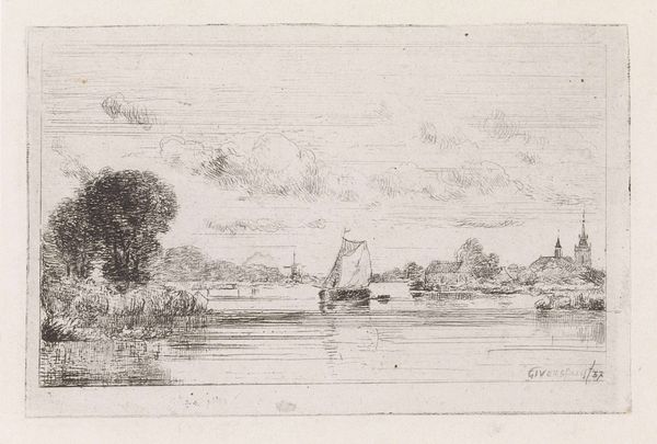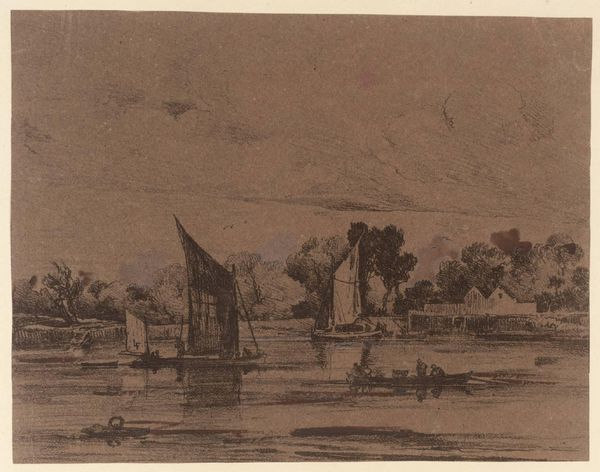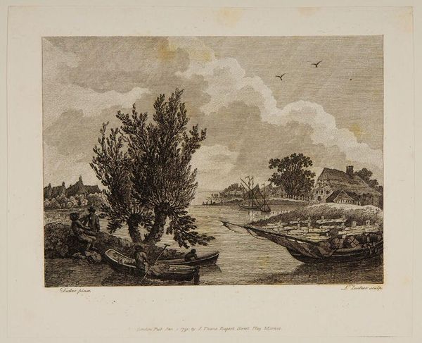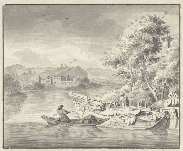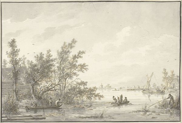 Editor: We're looking at "River View with Hay Barge," created between 1795 and 1821 by C. Dietrich. It's a drawing, almost ethereal in its softness, like a memory captured in pencil. What do you make of this quiet landscape? Curator: Quiet indeed! It whispers, doesn't it? The artist's delicate hand renders this scene with such tranquility; the almost monochrome palette certainly amplifies the stillness. And you have a boat pulled by cattle laden with hay—it's a charming paradox, really. Tell me, what feeling does the artist's choice of subject matter evoke for you? Editor: There's a certain humility to it, I think. Everyday life, captured with such gentle artistry, like pausing to notice beauty in the mundane. Curator: Exactly! Perhaps Dietrich is inviting us to find grandeur in simplicity. Did you notice the reflections on the water’s surface? This careful touch enhances the reflective quality, which almost prompts us to consider: what everyday moment has resonated most with us today? It's about light and atmosphere, but more than that, it captures a specific sense of place, doesn't it? Editor: Yes, and the vastness of the sky somehow dwarfs the figures on the barge, emphasizing the power of nature. The artist uses soft shading in the sky, almost imperceptible but so present, contrasting with the sharper lines of the trees. Curator: Precisely! You’ve touched on something crucial. And the perspective... See how our eye is drawn into the distance? This piece celebrates both the vastness of the landscape and the intimate details of daily existence, reminding us of our own transient position within this broad scope. It's subtle yet profoundly resonant. This is what makes art from this time period continually alluring to a viewer such as ourselves!