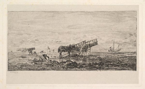 Editor: Here we have Isaac Weissenbruch's "Ship in a Storm with Ropes Held by Men on the Coast," a pen drawing likely created between 1838 and 1912. The turbulent sea and precarious position of the ship evoke a sense of impending disaster. How do you interpret this work within its historical context? Curator: This drawing powerfully depicts humanity's struggle against the raw forces of nature. But I am interested in who is in the center? The coastal population looks like a mob, ready to plunder? The image needs to be seen not only as a dramatic scene, but as a reflection of social anxieties around maritime disasters and coastal communities’ vulnerabilities in the 19th century, which faced great risk of total collapse. Editor: So, it is a social commentary? What does the fact that the image seems almost like a sketch say? Curator: Precisely. The sketch-like quality heightens the sense of immediacy and instability. This wasn't a polished, idealized depiction, but a raw, visceral portrayal of a real or imagined event. Considering Weissenbruch’s background, we might also ask how his artistic choices amplify or perhaps critique the romanticism often associated with such scenes. Does the artist glorify or condemn it? Editor: That’s interesting. I hadn't thought about the artist's perspective that way, but it does change how I see the people onshore and the ropes between them and the sailors. Are they helping or pulling them into danger? Curator: Exactly! And that tension, that ambiguity, is where the power of the work truly lies. This wasn't simply a record of an event; it's an invitation to contemplate the complex relationship between humans, nature, and society. How these communities depended upon one another during disasters. Editor: I'm starting to think of it not just as a dramatic scene, but also as an intersection between human action and environmental forces, with themes of survival and potentially social critique intertwined. Thank you for sharing a great perspective! Curator: Absolutely, it’s in the questioning of these representations that we start to unpack and reveal so much of the culture. The function and significance of the drawing is not simply what it shows but what it invites the viewer to debate and unravel.