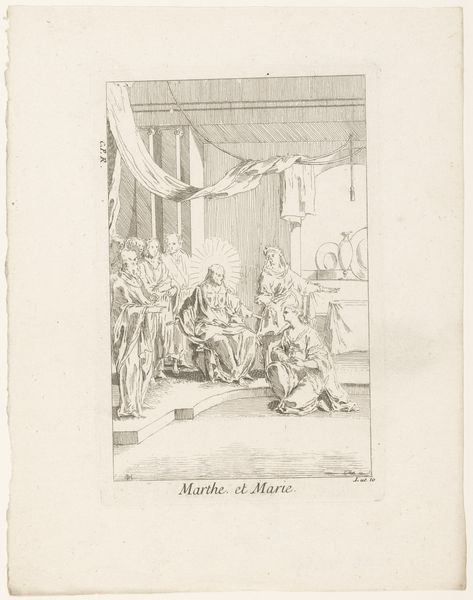 Gabriel Huquier created this print, ‘Opwekking van de dochter van Jaïrus’, using etching. The composition, rendered in delicate lines, captures a moment of dramatic tension. The eye is immediately drawn to the figure of Christ, centrally positioned and radiating light, as he gestures towards the inert form of Jairus' daughter. Huquier’s use of line and space organizes the chaotic scene into structured clarity. The etching technique allows for a detailed rendering of textures, from the draped fabrics to the concerned faces of the onlookers, each line contributing to the overall sense of movement and emotion. The composition invites us to consider how the spatial arrangement reinforces the narrative, positioning Christ as a pivotal figure whose divine power disrupts the natural order. Notice how the formal qualities of this etching serve to heighten the emotional and theological impact of the scene. The lines and their arrangement invite us to interpret the deeper meanings of the miracle and the relationship between the earthly and the divine. The careful rendering and spatial dynamics of the work encourage viewers to engage with the print both aesthetically and intellectually, questioning its enduring themes of faith and resurrection.