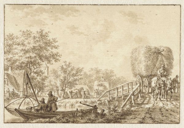 Curator: This etching by Adriaen van Ostade, titled "Two Anglers on a Bridge," dates back to 1647 and captures a seemingly simple, everyday scene. Editor: My first impression is of stillness, a muted intimacy despite the landscape setting. The composition directs my gaze towards the central bridge, emphasizing its weathered materiality. Curator: Precisely. Van Ostade was known for his meticulous attention to detail in rendering scenes of peasant life and rural environments. We see here the techniques of etching and the subsequent prints that were widely sold and collected during the Dutch Golden Age. Note how he uses line and cross-hatching to convey light, shadow, and texture, all stemming from an elaborate series of labor processes in the studio. Editor: Yes, the layering of lines indeed builds a complex tonal range that mimics a sense of decay. The very subject is so closely rendered through texture—the roughness of the wooden bridge contrasted against the relative smoothness of the water below. The composition is interesting: how the figures, in their slight slouch, subtly echo the bridge’s own downward slant. Curator: It's not just about what's depicted, but the social and economic factors involved. The ready availability and affordability of prints like these democratized art consumption during the period. This print represents more than just anglers and a bridge; it is about the conditions of artistic production and the accessibility of imagery for a wider audience. Editor: Absolutely, and if we see these angling figures from a more formal perspective, notice the interplay of vertical and horizontal lines creates a stable yet visually interesting image. And in this stability we receive that pervading muted feeling that I detected initially. The material presentation—black lines on white—yields to quiet observation in that contrast. Curator: Ultimately, works like "Two Anglers on a Bridge" reveal much about 17th-century Dutch society: their values, pastimes, and how art circulated within their communities, which allows for considering how a single artwork could both reinforce and negotiate class structures. Editor: Indeed, from both the visible structure of the bridge itself to the deeper composition it reveals that Dutch painters held unique relationships to the passage of time and quiet moments. Curator: A valuable thing to be reminded of through observing Ostade's work here at the Metropolitan Museum of Art. Editor: A contemplative exercise to partake of in this viewing of this modest yet well designed print.
