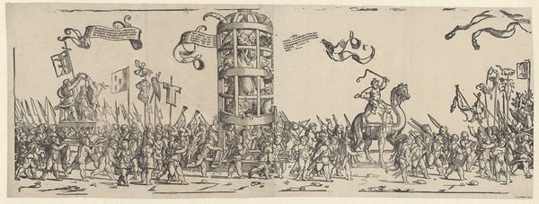 Editor: This is "Spotprent op de Franse expeditie naar Egypte, 1799," a colored pencil, etching and print by James Gillray, likely created in 1799. It seems chaotic, with a mob attacking a column. What strikes you about this piece? Curator: What interests me most is how Gillray utilizes accessible printmaking to critique power. Consider the etching itself: a relatively inexpensive and reproducible medium, making it available to a wider audience beyond the elite art patrons. What’s being *made* here? A challenge to established authority, visually distributed *en masse*. Editor: So the medium is the message, almost? Curator: Exactly. Think about the materials: paper, ink, pencil. Simple, almost mundane. Yet, Gillray transforms them into potent commentary. The choice of colored pencil adds another layer – it’s not the refined medium of high art, but something more accessible, lending itself to caricature and satire. Editor: I see what you mean. It does feel less formal than a typical history painting. Curator: Precisely! Gillray deliberately blurs the lines between “high” and “low” art. It's also not just the physical materials. It’s the entire system of production. Prints like these were often commissioned and sold in print shops, becoming part of a bustling market for political satire. Who *consumed* these images and what impact did it have on the social consciousness of the time? That's what fascinates me. Editor: I hadn't considered the commercial aspect of political cartoons at that time. Curator: Considering the artwork as product, not just symbol, can provide different understandings of it and the context it was created in. Editor: This reframes how I think about the piece entirely. Thanks! Curator: Indeed! And that constant interrogation of materials, method, and audience involvement is where we can understand this artwork’s real impact on art history.