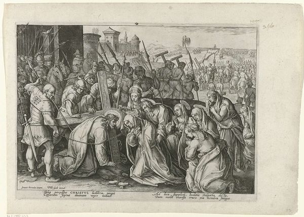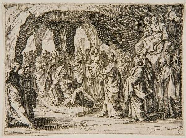 Curator: This is Jacques Callot's "Resurrection of Lazarus", a small but intensely detailed etching. The crowd gathered around Lazarus is really striking. Editor: It's dramatic, for sure. I'm immediately drawn to the stark contrast between the dark, cavernous space and Lazarus himself. It feels very theatrical. Curator: Yes, Callot really captures the moment of miraculous transition. The detail in the figures' robes, the rocky textures... it's amazing considering the size. It makes me think about the tools he used, and how many hours he spent carefully layering those lines. Editor: Absolutely. And the way he uses line to create depth and shadow is masterful. I wonder about the availability of copper plates at the time, and if that influenced the scale. Did he choose this scene to showcase his skills with such challenging material? Curator: Perhaps. Or maybe the intimacy of the small scale makes the miracle feel even more profound, a personal awakening rather than a grand spectacle. Editor: That's a lovely thought. Either way, it's a marvel of craft and storytelling. Curator: Indeed. It’s a reminder that even the smallest of objects can hold immense power.