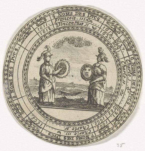 Curator: Oh, this unassuming engraving from 1706. It's called "Penning met een embleem en de namen van de hertogen van Savoye," essentially a medallion commemorating the Dukes of Savoy. An anonymous work. Editor: My first thought? It feels like gazing into an astronomer's drawing of some strange new planet, all miniature landscapes and regal script. Curator: The radial design certainly gives it that celestial quality. See how the landscape scene sits at the heart, ringed by the names and dates of the Dukes, almost like tracking orbits through time. I’d say it uses geometric pattern, mountain landscapes, portraits, and elements of historical painting to make a medieval emblem! Editor: And the landscape itself seems to carry its own quiet drama. The smoky haze of what I think are canons far away on the left. There's a person down below—maybe fleeing toward safety at the small structure? This idyllic scene seems underscored by subtle notes of disruption. I want to know what all this means and how they fit into the geometric representation! Curator: Yes, that's an interesting tension, isn't it? While we celebrate the Dukes' lineage, this image reminds you about the fragility of their state and maybe their power too. The title "NON. PENETRANT.RADII", might suggests, 'Rays do not penetrate' referring to light, enlightenment, knowledge—perhaps inaccessible or obscured during this historical period, maybe alluding to political obfuscation? Also, Savoy was often caught between larger European powers. So this image, as a historical marker, is also making an argument of its sovereignty. Editor: And that, I suppose, is the magic of art, to compress so much meaning, even with anonymous creator. Every delicate line telling tales within tales, even down to those skulls right before "NOMS DES DVCS"... are we really sure who celebrated whom with this? Curator: Precisely. It's a multi-layered, fascinating image, revealing aspects of its era's socio-political awareness. A reminder that even in apparent tributes, a touch of critique is often stirring just below the surface. Editor: Right, who knew so much could be evoked in such an ostensibly formal piece. Thanks for helping me dive deep into this work. I'll leave it here a little bit longer while I soak in all this visual information.