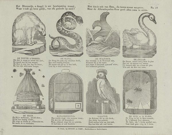 This print titled Vogels, or Birds, was made by Gerhardus Philippus Zalsman in the 19th century. It's a lithograph, meaning it was created by drawing on a flat stone or metal plate with a greasy substance, then inking the surface and pressing it onto paper. This process allowed for relatively quick and inexpensive reproduction, making images like this accessible to a wide audience. The graphic, linear quality of the print speaks to the nature of lithography. The artist meticulously rendered each bird with precise lines and shading, capturing their distinct characteristics. Look closely, and you'll see how the varying line weights and densities create a sense of depth and texture. Prints like this played an important role in disseminating knowledge and shaping public perception of the natural world. They were often used in educational materials, scientific illustrations, and popular culture, contributing to a growing awareness of the diversity and wonder of the animal kingdom. This print showcases how industrial processes played a key role in creating, shaping, and spreading knowledge in a way that connected to both science and art.