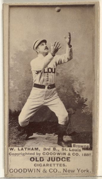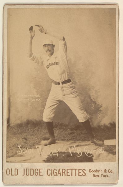 Editor: Here we have a rather sepia-toned image titled "John Good 'Long John' Reilly, 1st Base, Cincinnati," a baseball card really, from 1888. It was created by Goodwin & Company for Old Judge Cigarettes. He's mid-pose, ready for a catch I suppose. There's a sort of quiet dignity to the whole thing. What stands out to you? Curator: You know, what's striking is how this little card, a tiny rectangle of commerce, becomes a time capsule. Cigarette cards weren't just advertising, they were a slice of life. A portrait, even if mass-produced, captures an essence. Reilly here isn't just a ballplayer, he's an icon, a representation of burgeoning American pastimes, a wisp of fleeting celebrity embalmed on cardboard. Do you think folks saw it as art then? Or something disposable? Editor: That’s a fascinating question! I’d guess disposable. But today, finding it in the Metropolitan Museum of Art definitely elevates it. Though, I can't help thinking about the context… cigarettes… this charming portrait was essentially advertising something that kills. Curator: Ah, yes, the delightful paradox. That dissonance makes it even more compelling, don't you think? It challenges our own romanticized view of the past, throws a curveball, if you will, into how we interpret history through objects. Does this complicate, perhaps, the initial "dignity" you perceived? Editor: Absolutely. It's not so simple, is it? Seeing the portrait detached from that advertisement, it becomes easy to miss the connection to Big Tobacco and how insidious that was even back then. Curator: Precisely. It reminds us to look closer, to ask more questions, to be a little wary of those nostalgic sepia tones, right? Every image whispers stories – some are heroic, some… not so much. Editor: This was so insightful. I'll definitely view historical images differently.