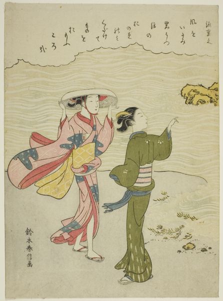 This is an illustration of a poem by the Emperor Kwoko, made by Utagawa Kuniyoshi sometime before 1861, using woodblock printing. The composition is dominated by large expanses of white and pale blue, evoking a cold, snowy landscape. We see the Emperor beneath a large umbrella, his patterned robes a stark contrast to the surrounding figures in simple, lighter garments. The figures on the left, with their round hats, add a rhythmic, almost musical quality to the scene. The shapes are simplified, almost abstracted, emphasizing form over detail. Kuniyoshi here seems interested in the interplay between text and image. The calligraphy at the top is not merely descriptive but acts as a visual element, balancing the figures below. The poem itself adds layers of meaning, perhaps reflecting on impermanence or the beauty found even in bleakness. The structural opposition between the Emperor and the other figures highlights the social hierarchy, with the Emperor set apart. Note how Kuniyoshi uses this opposition, not just aesthetically but also as part of a larger discourse on power, representation, and the transience of life.