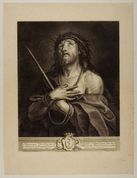 "Christ Crowned with Thorns" is an engraving by Grégoire Huret. Made during a period of religious and political upheaval in Europe, the image encapsulates themes of suffering, sacrifice, and divine authority, central to Christian iconography. Here, Huret offers us a portrait of Christ that invites contemplation on the burden of leadership and spiritual devotion. The crown of thorns, meticulously rendered, becomes a poignant symbol of pain and humility, challenging traditional representations of power. The Latin inscription that surrounds Christ’s head establishes his various roles, such as ‘King of Peace’ and ‘Savior of the World’ in an effort to synthesize religious thought with the current climate. This print underscores the emotional weight of religious conviction, suggesting a narrative of endurance and hope that continues to resonate across different cultural contexts. The image doesn't just depict a moment of suffering; it prompts a reflection on the intersections of faith, identity, and the human condition.
