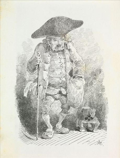 Curator: Ah, yes. John Leech's "Paris 1856." A rather intriguing drawing rendered with graphite, ink, and coloured pencils on paper. Its satirical edge is hard to miss. Editor: Satirical is an understatement. I'm immediately struck by the blatant anthropomorphism—a bear dressed to the nines in what looks like aristocratic attire, smoking a cigarette! The whole thing is both absurd and strangely compelling. Curator: Precisely! Leech was a prominent social commentator, particularly during the Victorian era. Caricature was his weapon. This drawing, like much of his work, likely comments on the social or political climate of Paris in 1856, potentially satirizing the powerful. Editor: The choice of a bear is fascinating. Bears are often symbols of brute strength or untamed wilderness. Putting it in a waistcoat with what looks like an order pinned to it and a rather jaunty hat, smoking nonchalantly – it dismantles that expected narrative. Could it be a comment on power and its often-uncivilized underbelly? Curator: Absolutely, it resonates with observations by later theorists such as Gramsci on hegemony. Consider, too, that caricatures often targeted specific individuals, sometimes even nations, through animal symbols. It was a way to critique authority under the veil of humor. The context of 1856 Paris is vital. This followed the Crimean War. Was this a depiction of Russia maybe, or some alliance? The timing would be crucial. Editor: Interesting angle. It invites consideration of how nations projected power. I also see how it disrupts societal hierarchies by implying they are built on arbitrary constructs. Anyone, or anything, can wear the clothes of power; in fact, the bear looks entirely out of place in that outfit. I think this speaks to how effectively art uses humor to point to profound social and political critiques. Curator: I agree wholeheartedly. Leech understood the power of visual communication. His satirical lens allows us a glimpse into Victorian society's perceptions and anxieties around class, power, and international politics. His skills lay not only in art but shrewd social observation. Editor: Ultimately, Leech's piece makes us question the figures and emblems that shape the way societies are structured. What initially strikes one as a humorous sketch soon unfolds to highlight some persistent concerns related to representation, power, and cultural critique.