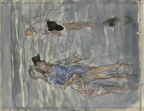 Curator: This "Untitled" work is an acrylic painting by Kateryna Lysovenko, completed in 2022, exhibiting features of modernism while hinting at figuration and exploring the nude. What are your first thoughts? Editor: My immediate impression is a somber dreamscape. The figures floating in the dark blue call to mind both intimacy and alienation, a curious coupling made even more apparent by the application of thin paint on what seems to be raw canvas. Curator: It definitely has a dreamlike quality, almost a mirrored reflection. The ochre and sienna tones are very earthly but contrasted against the darkness it reads quite beautifully, wouldn’t you say? There's this real dance of weightlessness. Do you find a grounded-ness in the earthiness of the colors? Editor: I’m fascinated by the raw materiality and simple tools employed here. It feels almost like a rehearsal for something larger. Acrylic on canvas from an artist, the labor isn't necessarily about refinement or illusion. Look at the production: The visible canvas creates this layered effect and emphasizes, paradoxically, a kind of constructed "natural" beauty. What is natural, here? The nudity or its depiction through obviously artificial means? Curator: It's funny, isn’t it? This contrast. The figures themselves seem simplified, but not simple. Like outlines of something intensely felt, something profoundly internal. Are they rising or falling? Editor: It's hard to say. Perhaps they represent figures struggling through a dark material world. Their embrace signifies more a connection formed through struggle, through shared labor. Or maybe simply through making, through art as an act. Curator: Lysovenko often explores vulnerable and quite frankly human states of being through figuration. There’s almost a narrative pull despite the stillness. A very modern dance between exposure and… is it protection, perhaps? Editor: Interesting way of putting it, because these "vulnerable" nude figures really emphasize for me not fragility but material connection through visible human making in Lysovenko's chosen processes. That embrace shows how we are formed through material circumstances. It’s an almost anti-Romantic take. Curator: An act of raw empathy or, to borrow your sentiment, “material connection,” in pigment, perhaps? Thank you, that's certainly changed my perspective. Editor: It goes to show what a closer consideration of materiality and the human making can do for an image.