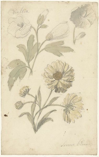 Editor: Here we have "Study of a Yellow Tulip and Another Plant" by Elias van Nijmegen, dating somewhere between 1677 and 1755. It's a watercolor and drawing, a rather delicate botanical study. What jumps out at me is the fragility of the materials and the detailed, almost scientific, approach. How would you interpret this work? Curator: Given my materialist lens, I'm most interested in the circumstances of its creation and consumption. Watercolors and drawings like these were not simply "art." Consider the price of pigments at the time – some colors were far more expensive than others, hinting at the resources available to Nijmegen and his patrons. Who would have commissioned or purchased this work, and what purpose did it serve in their lives? Editor: So you’re saying the cost of the materials impacted who could create and own such a work, therefore influencing the subjects represented and artistic development overall? Curator: Precisely. Tulip mania was also still within living memory. The image may act not only as a scientific or aesthetic study but could simultaneously evoke the rampant market and speculative anxieties of the recent past. How does that inform the viewer's interpretation of beauty and value? The making of images isn't neutral. Editor: That’s a compelling connection that the materials used, like the watercolors themselves, had socio-economic significance beyond the image they helped create. I never considered it that deeply before. Curator: It prompts questions about the art market then versus now and our role in either reinforcing or challenging the commodification of art. These issues around labor, value, and social hierarchies within artistic practice remain current concerns.