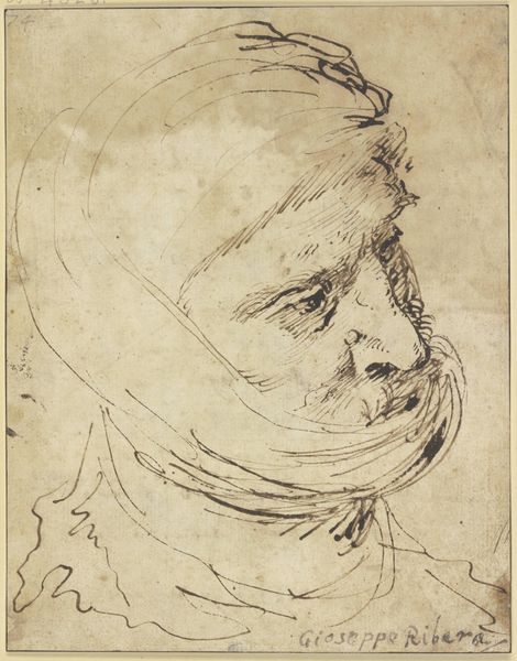 Editor: Here we have "Large Grotesque Head," an etching by Jusepe de Ribera from the early 17th century. It’s quite a striking image. The texture of the skin, the depth of the shadows... it’s all incredibly intense. What do you make of it? Curator: The immediate impact arises from the strategic use of line. Note how Ribera manipulates the density and direction of etched lines to define form and texture. The concentration of lines around the figure’s left side and neck creates a stark contrast, accentuating the grotesque details and conveying a sense of weight. Do you notice the different techniques used to convey form? Editor: Yes, in some areas the lines are very close together, almost like shading, while in others they are more sparse and create a sense of light. How does this all contribute to the overall reading? Curator: Exactly. Ribera is manipulating our perceptions through pure mark-making. By creating contrast and a visual rhythm, Ribera commands the viewer's eye, directing us to the areas he wishes to emphasize, thus enhancing the overall grotesque effect. It’s a technical display used to heighten the dramatic impact. Editor: So it's the "how" rather than necessarily the "why" that holds the key? Curator: Precisely. While cultural and thematic contexts provide insight, analyzing the artist's formal decisions grants us a deeper understanding of the artwork's essence and its effect on the viewer. Editor: I’m seeing a whole new layer of intention now. The way he guides our eye using just lines and shadows, it’s all much more deliberate than I first realized. Curator: Indeed. The power of close visual analysis allows us to understand and decode an image like this.