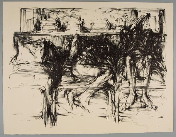 Curator: Rodrigo Moynihan, born in 1910, captured this rather bleak scene in his work, "Dead Tree at Nigadoo Lake." Editor: It's definitely melancholic. The washed-out blues and grays create a sense of desolation, that stark vertical reflection of the tree in the water is unsettling. Curator: Moynihan, known for his abstract and representational works, uses watercolor and ink to create a sense of transience, mirroring perhaps his own feelings about mortality. Editor: The composition is so simple. That single dead tree, stark against the muted sky and water. Its form, almost dissolving into the lake, speaks to the ephemeral nature of life. Don't you think? Curator: Yes, there's a powerful suggestion of decay, a stripping back to essentials both in form and emotion. It invites us to contemplate the cycle of nature, and maybe our own place within it. Editor: In a way, it’s hauntingly beautiful. I appreciate how such minimal gestures evoke such profound emotions. Curator: Absolutely, a subtle yet evocative work.