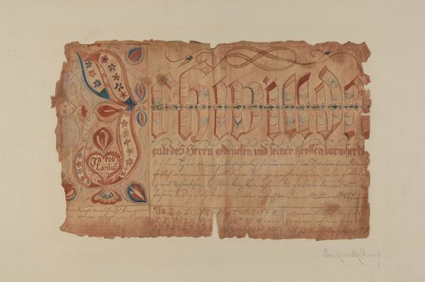 This birth certificate, or Fraktur, was made by Ethelbert Brown, probably in Pennsylvania, using watercolor on paper. The materials themselves are simple, humble even. It is the artistry that elevates this document. Consider how the watery medium allows for soft, blended colors, creating a gentle atmosphere. The symmetrical floral motifs, while appearing folk-art naive, are carefully rendered. These traditional motifs suggest a deep connection to the region's cultural heritage, passed down through generations. The text itself, hand-lettered in German, further emphasizes the personal touch and cultural identity embedded within the document. It speaks to a community valuing both artistic skill and the preservation of their traditions in a new land. Documents like this challenge conventional notions of ‘high art,’ revealing the artistic expression embedded in everyday life, celebrating the skills and cultural heritage of ordinary people.