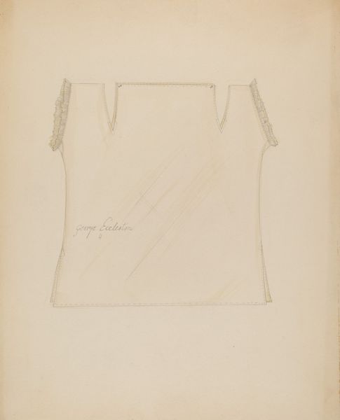 Curator: Ah, this pencil drawing, entitled "Sugar Merchant's Suit (Pattern)," created by Henry De Wolfe sometime between 1935 and 1942, really stands out. Editor: My immediate reaction is one of intriguing quietude. The lines are so delicate; it’s almost like viewing an architectural blueprint, but for clothing. It feels… purposeful but understated. Curator: It is interesting how De Wolfe presents these suit pattern pieces. It resembles not just design but also speaks to an almost alchemical transformation: a raw material turned into refined adornment. Sugar—symbolic of wealth, luxury—paired with a merchant’s tailored suit signifies status, power, and perhaps even global exchange. Editor: And let’s think about what this actually represents. These aren’t just abstract lines. This is about labour, production, and the construction of identity. De Wolfe's meticulous depiction of patterns gives importance to craft, to process itself, pushing against the grain of "high" art versus "applied" art. One wonders where, when, and by whom the garments would have been assembled. Curator: Indeed! The symbolism could also allude to larger societal structures, where sugar represents both desire and potentially the bitter history of exploitation involved in its production. Editor: Precisely. Furthermore, considering it’s pencil on paper, we also engage with an unvarnished record of thought; the artist making visible what is so often hidden – the construction phase prior to consumption, the physical marks required for sartorial invention and realization. Curator: Right. Those are the crucial connections to history and social context I seek. What stories do these images have to tell? And how do they keep being retold through the passage of time? Editor: I am left contemplating all the labour involved in this image, too -the sugar trade, the suit design and finally De Wolfe’s steady hand capturing all those layers for posterity! Curator: Absolutely, contemplating De Wolfe’s artwork, for me, underscores how images continue to evolve within collective consciousness. Editor: And from my point of view, prompts a deeper investigation of production processes to reveal wider socio-economic truths.