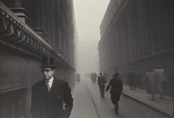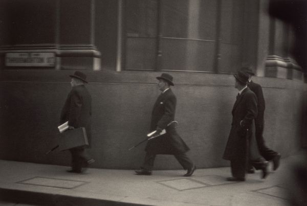 Robert Frank made this gelatin silver print, titled "City of London," sometime during his career. Frank, a Swiss-American photographer, is known for his raw, documentary-style images that often captured a sense of alienation and social tension in postwar society. Here, we see two men in bowler hats walking on a city street. The bowler hat, a symbol of British formality, and the formal suits, might speak to the rigid class structures of mid-century London. The grainy texture and stark contrast lend a certain anonymity, perhaps reflecting Frank’s outsider perspective as a foreigner observing the city. Frank once said, "When people look at my pictures, I want them to feel the way they do when they want to read a line of poetry twice.” The photograph invites us to consider the nuances of identity, class, and belonging, and to reflect on the emotional undercurrents of urban life.