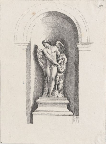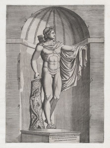 Curator: Isn't it curious how an artwork can whisper stories across centuries? This photographic reproduction, dating back to the late 19th century, captures Raphael's fresco "Venus and Jupiter" from the Farnesina in Rome. What's your initial take on this particular rendering? Editor: Stark! It feels so divorced from the vibrant life of a fresco. This photographic translation transforms Raphael’s airy embrace of gods into a study in contrasts, emphasizing the textures but flattening the depth. Curator: Indeed. I find it fascinating how the photographic process here shifts our focus. What Raphael painted to evoke airy grace, Domenico Anderson, the photographer, re-presents as a document of a previous artwork. It raises the question: does photography preserve or transform? I wonder how the artisans, who likely meticulously copied Raphael’s vision, felt about their craft being further reproduced through mechanical means? Editor: That’s a brilliant provocation! We tend to valorize "original" artistic creation, obscuring the labor involved in its reproduction. It puts into question what even *is* art? Was it in the touch of Raphael’s brush? Or in the reproducible images for popular consumption? Was its value social, economic, devotional, all of these at once? Curator: Exactly! And look at the composition itself. Raphael placed Venus and Jupiter nestled within an allegorical arbor, and we view it, now, flattened, through Anderson's lens. Editor: Right, you lose the illusion, or any trace of artifice. And you’re confronted with the social fact of its making! I’m captivated by how this reproduction implicates artistic production—all that labor involved. Curator: It makes you reconsider, doesn’t it? So, as we turn from this work, are we left considering photography's deceptive nature? Editor: Or its illuminating one, showing us what’s really *behind* even the loftiest-seeming creations.