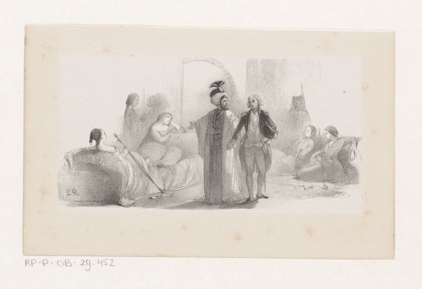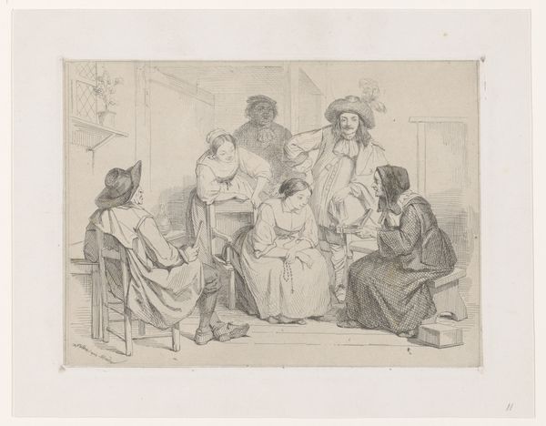 This is a monochromatic print called "Groep mannen aan tafel" by Charles Rochussen, made with etching. The composition centers around a gathering of men, seemingly engaged in a lively meeting, around a table laden with bottles. Rochussen uses a dense network of fine lines to articulate form, creating varied tonal effects that delineate light and shadow. The arrangement of figures, some seated and others standing, gives a sense of dynamic, candid activity frozen in time. This is a visual rhetoric which is an exercise in the representation of social interaction and class dynamics. The artist is offering us not just a snapshot of a social gathering, but also an invitation to decode the underlying structural relationships at play within this social microcosm. It leaves us contemplating the intricate dance of power and representation.