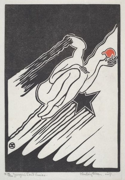 Editor: Here we have Will Bradley's striking poster design for "The Echo, Chicago, May 15, 1895." The stark color palette gives it such a dramatic, almost theatrical feel. I am interested in how shapes create this effect; what are your insights on this piece? Curator: Indeed, it's fascinating to observe the interplay of forms and colors Bradley employs. Note how the flat, unmodulated black of the figure's cloak dominates the composition, its sweeping lines echoing the implied movement of wind. Editor: I do see that movement, especially how the curve created by the cloak leads my eye up toward the subject’s face and hair, like an upward diagonal line. Curator: Precisely. The touches of warm color provide contrast and emphasize the planar quality. Do you notice how he manipulates positive and negative space, establishing the two-dimensionality of the image? The work, thus, refuses any deep illusion of form or depth. Editor: Yes, it feels very flat. Like, you are supposed to view it as a purely visual composition, rather than something that depicts reality. The composition takes precedence over everything. Is that typical of Art Nouveau? Curator: You have identified an essential element of the style. Art Nouveau prioritizes decorative beauty achieved through line, color, and composition, even at the expense of realism or verisimilitude. Editor: It’s interesting how breaking from those rules actually enhances the message. Thank you for elaborating. Curator: It has been enlightening to analyze the elements. I leave this with renewed insight into Art Nouveau's formal preoccupations.