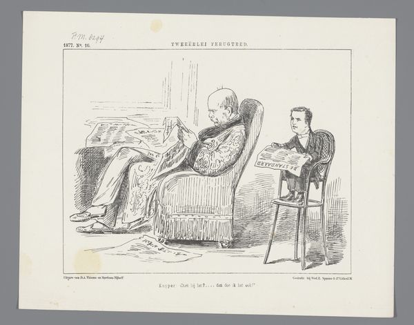 Curator: This drawing, created in 1875 by Johan Michaël Schmidt Crans, is titled "Spotprent op de debatten in de Eerste Kamer over de Rijnspoorwegmaatschappij," or "Cartoon on the debates in the Upper House regarding the Rijnspoorwegmaatschappij." It's executed with pen, and immediately gives me a feeling of social commentary. What strikes you first? Editor: It's the rawness of the line work that stands out. You can practically feel the scratch of the pen on the page. And the scale—there's a stark contrast between the towering woman and the diminutive boy that pulls me right in. Curator: Precisely. Notice how the artist utilizes visual cues, such as the oversized chair, to convey a sense of authority and power. It reminds us of archetypal scenes where figures in positions of dominance scrutinize those they oversee. Editor: Absolutely, and I am curious about this "Ferrie" scrawled on the tablecloth. Is that referencing the material conditions surrounding the railway debates? Maybe some type of fabric deal gone awry influencing decisions being made by the depicted maternal figure seated in this authoritative space? The visible textual context adds another layer for sure. Curator: Indeed! The text gives us insight into its specific political moment in Dutch history. In a broader symbolic sense, perhaps this child represents some sort of moral transgression in railway deals. The artist makes the scene universally recognizable in its visual structure by echoing classic depictions of morality tales through archetypes and characterizations. Editor: It makes you wonder, what other deals were done or are being done under the cloth of statehood. This critical commentary emphasizes labor behind politics, suggesting there are deeper issues interwoven into public affairs that call into question consumer ethics beyond commodity or train rails themselves. Curator: The interplay of the scene is complex in how a child figure becomes more than a symbol of pure innocence. Instead the picture plays upon how all individuals in public service may suffer through such character assessments under parliamentary scrutiny or a 'parent' reprimanding any action viewed inappropriately for personal agenda against society at large. Editor: I agree. From that angle, you start really dissecting at whose expense are these gains coming, right. And while looking in the scope in context. I'm just more interested material side from who all benefits off resources used up at which stage and whose hands produced work overall; so I ask how will people remember their hands as contributing during period and how they would want seen compared those times based context given versus history recorded formally instead maybe differently like depicted by Schmidht Crans and if material accounts differed radically... Curator: It gives one a whole new context. Editor: Exactly! That raw ink encapsulates not just form, but also reveals power's touch at various historical levels.