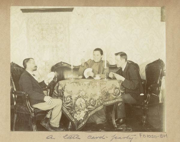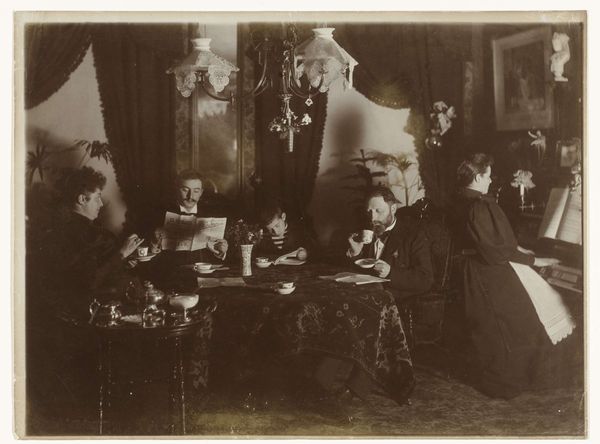 This is an undated photograph titled "Familie aan tafel" by Hendrik Herman van den Berg. The sepia tones and the arrangement of figures evoke a sense of bourgeois formality and familial hierarchy. Van den Berg’s composition invites a semiotic reading: the seated figures are arranged around a table, a clear signifier of domesticity. The table covering, with its dense floral pattern, introduces a layer of complexity. Note how the artist has used contrasting tones to define each figure, imbuing them with a distinct presence. The figures are placed deliberately to create a sense of depth, the artist engages with formal techniques that invite us to consider questions of class and representation. This seemingly simple family portrait becomes a tableau of societal roles, a discourse around tradition and representation.