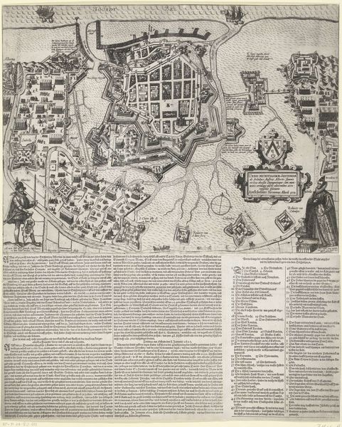 Curator: I am struck by the intricacy and ambition of this print, “The Siege of Ostend and the New Storm Bridge, February 1604,” made anonymously. The engraving captures a detailed aerial perspective of the siege alongside technical illustrations. What catches your eye? Editor: The sheer labor that this print depicts. So much deliberate, material force being brought to bear. I’m drawn to the image of the "storm bridge," a construction to lay siege; a crude, monumental engineering. It appears heavy, cumbersome, and slow. Curator: Yes, the print meticulously documents not just the geographical layout of the siege but also the innovations in military engineering deployed. We can look at this work to study the politics of war during the Dutch Golden Age and what this meant to shape the space and resources of Ostend. The depiction of the storm bridge points to shifting values and cultural anxiety over war, labor, and trade. Editor: That makes me think of how the print functions almost as a manual or advertisement. The display of innovative technology suggests a fascination with the mechanization of warfare, potentially celebrating its ingenuity and efficacy. How the print’s distribution and consumption, therefore, furthered these goals. Curator: Absolutely. This image isn't simply a historical record. It's actively shaping perceptions of the siege, participating in a larger narrative of Dutch military prowess. Consider, for example, that by visually foregrounding this technical prowess it risks invisibilizing all those on both sides subject to violence. I find it telling how this period is often depicted via grand-scale prints that sanitize violence, instead of representing bodies suffering due to conflicts of this sort. Editor: True, the material violence and social costs remain unrepresented within the frame of the engraving itself. Its smooth lines conceal human trauma behind technological progress. Curator: Ultimately, in reading it through this lens we recognize this object performs both artistic and ideological work—defining how war and identity were fashioned in the 17th century. Editor: The artist captured this image on this specific material using deliberate material interventions to create an account of warfare. I come away appreciating the detail and considering the broader labor behind not only the subject it represents, but also the print itself.